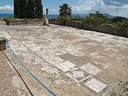 The mosaic was discovered during roadworks in late November 1960,[2] when Tunisian workers widening the road between La Malga and the presidential palace of Carthage[3] uncovered a large structure at the foot of the Hill of Juno. Historian Gilbert Charles-Picard referred to this structure as a "palace" due to its extensive mosaics.[4] The building, located a few meters downhill from another structure with columns, was in a deteriorated condition.[5]