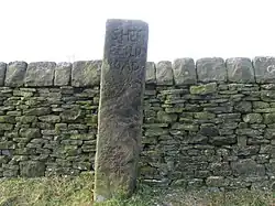The current Moscar Cross (also known as "Humblestone Cross"; grid reference SK231883), is a guide stoop erected in the 18th century, at a parish boundary and packhorse track junction. It is thought a cross existed at the point during earlier periods. The name 'Moscar' is thought to derive from to 'moss' (mos) and 'carr' (kjarr) both referring to marshy areas.[3][4][5] Moscar Cross has been claimed as the location of 'Whitcross' in Charlotte Brontë's novel Jane Eyre.[6]