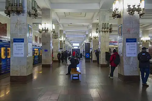 Moskovskaya (Russian: Московская) is a station on both Line 1 and Line 2 line of the Nizhny Novgorod Metro. It was one of the first six stations to open on the line on 20 November 1985.[1][2] It is also the only station that permits transfers from one line to the other; its two-platform and four-track layout allows a cross-platform interchange between the lines, wherein the central tracks serve Line 1, while the outer tracks serve Line 2. The station also allows the passenger to transfer may also transfer to the Nizhny Novgorod railway station and the Nizhny Novgorod City Rail