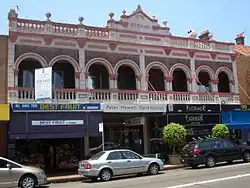 Mosman's shopping centre is located along Military Road, which features many boutiques, cafes and restaurants. The shopping centre extends from the intersection with Bradley's Head Road and Middle Head Road and continues north up past the intersection with Spit Road at Spit Junction. It continues for some distance along both Spit Road and Military Road and extends down some of the side streets. Mosman Council has identified the early 20th century shopping strip along Military Road as a conservation area. The awnings along the street were originally column-supported.[38] A small shopping mall called Bridgepoint is located at Spit Junction. The Military Road Conservation Area also includes the row of shops at 581-595 Military Road, on the southern side of Military Road between the Town Hall and the Library Walk shopping complex. These shops, built from 1900 to 1904, were designed by Henry Austin Wilshire, and are included on the NSW Heritage database.[39]