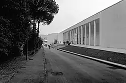 The Latin America Pavilion constitutes the other half of the headway leading to the Fountain. Designed in 1938 by Bruno Lapadula as a group of Bank of Italy pavilions arranged around a garden courtyard. On the façade overlooking the fountain was a painting by Giorgio Quaroni. The pavilions were damaged by war bombings and subsequently restored for the reopening in 1952 on a project by Michele Capobianco, Arrigo Marsiglia and Alfredo Sbriziolo. The 1952 project endowed the pavilion with a loggia characterized by a rationalist appearance with typical Nordic origins that recall in particular the Dutch neoplasticism and the slender steel structures of Ludwig Mies van der Rohe. Currently the pavilion has been recovered by Studio Campagnuolo and Cherubino Gambardella.[7]