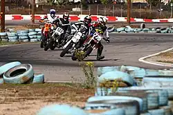 Prior to the 1990s, supermoto bikes, including the precursor motorcycles used in superbikes, were converted open-class two-stroke motocross or enduro bikes desired for their light weight and jumping abilities. The motorcycles currently used for supermoto racing are predominantly single-cylinder four-stroke-powered dirtbikes with 17-inch (430 mm), sometimes with 16.5-inch (420 mm) front wheels. The 17-inch (430 mm) wheels allow the use of up to 7.0-inch-wide (180 mm) superbike road racing slick tires.[4] These are often hand-grooved on the rear tire to facilitate slightly better acceleration on the dirt stretches of a supermoto course. Suspension is lowered and slightly stiffened in comparison with a stock dirt bike, and braking power is improved with oversize front brake rotors and calipers. Despite the lack of trees on supermoto courses, hand guards are frequently added to supermoto bikes due to the extreme cornering angles achieved by riders. Hand guards also greatly improve survivability of the brake & clutch levers during a fall making supermoto bikes highly crash resistant and often able to quickly re-enter the fray during a race following a crash.