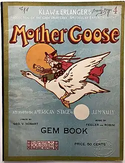 Mother Goose is a musical in three acts with music by Frederick Solomon, lyrics by George V. Hobart, and a book by John J. McNally that was adapted from Arthur Collins and J. Hickory Wood's libretto for the 1902 pantomime of the same name.[3] The work's plot pulled loosely from several fairy tales and nursery rhymes, including Mother Goose and Jack and Jill. The work also contained many songs interpolated into the production by other writers, including two songs by George M. Cohan: "Rube" and "Always Leave Them Laughing When You Say Goodbye".[4]