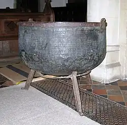 Various versions of the legend have existed.[10] The simplest version is that Mother Ludlam would loan utensils and that a large cauldron was borrowed but not returned; she became enraged and the borrower, scared by her anger, sought refuge in Frensham Church. The cauldron associated with this legend remains in the church to this day, but is believed by historians to have been used for brewing church ale in past times – made of hammered copper and measuring three feet in diameter and 19 inches deep, it is of the type that was commonly used in the Middle Ages for catering at parishioners' weddings and religious festivals.