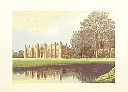 More and the rest of the community that fled traveled for seven days. More had been researching possible places of refuge in England before they had left, but was not immediately successful. During their first few weeks in London, the nuns lodged in various housing throughout the city. The nuns were mainly taken in by relatives of the community. Mother More urged the need for the community to find a “retreat that was discreet, permanent, and secure.”.[9] Eventually, they settled in Hengrave Hall near Bury St. Edmunds in Suffolk, owned by Sir Thomas Gage. Gage’s aunt was a former member of the community who had died in 1772. Gage charged More £60 per year for rent. More was extremely happy with the placement saying, “that the house resembles a convent by having cloisters below and galleries above.”[9] More and the rest of the community began furnishing the estate by making makeshift beds and furniture. The house also did not have direct access to water and the nuns had to take turns carrying water from the horseponds to the house.[10]