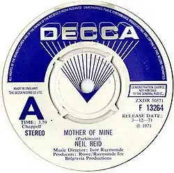 "Mother of Mine" is a song written by Bill Parkinson and made famous by a Scottish former child singing star Neil Reid, who sang it on ITV's Opportunity Knocks and won the competition on 13 December 1971, singing his version of the song.[1]