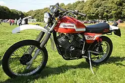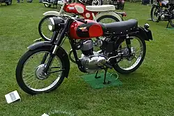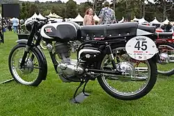 The engine has Heron heads,[11] which were milled flat, and the combustion chamber is recessed in the piston crown, aiding combustion and returning excellent fuel economy. A fuel consumption test by Motorcycling Monthly at Britain's Motor Industry Research Association in 1976 returned a performance of 65 miles per imperial gallon (4.3 L/100 km; 54 mpg‑US), while a 3½ bike carried rider and pillion passenger.[12] The engine also incorporated one piece forged steel crankshaft, ball main bearings (first series motors), plain big end bearings (second series motors), and the conrods run on a common pin, desaxe, and off-setting the cylinders to each other by 50 mm (2.0 in). Front and rear barrels and heads are interchangeable. VBH Dell'Orto (25 mm VHB 25 BS) square slide carburettors were fitted to the 350, with air fed via air-box with two filters.[11] Bore and stroke was 62 mm × 57 mm (2.4 in × 2.2 in), respectively.[11] The camshaft was driven by a small toothed belt, and was a revolutionary advance. They also included an electronic capacitor discharge ignition system designed by Ducati Elettronica. Early models had kick-start only but later ones also included a starter motor using three centrifugal friction shoes engaging the alternator rotor cover. The CDI ignition was powered by a coil in the alternator and using the kick-start a bike could be started and ridden with a flat battery.