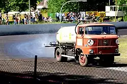 The track surface consists of four layers of grading. The topmost of which must be of shale, granite, brick granules or other loose material of which no individual piece can be over 7 millimetres (0.28 in) in size. Competitors use this surface to slide their machines sideways (powersliding or broadsiding) into the bends using the rear wheel to scrub-off speed while still providing the drive to power the bike forward and around the bend. The skill of speedway lies in the overall ability of the rider to control his motorcycle when cornering and thus avoid losing places through deceleration. The use of asphalt, concrete and tarmac for any layer is prohibited. The top layer must be levelled or "graded" at intervals during an event by tractors towing specially adapted rakes to evenly re-distribute the surface. Tracks are watered before and, if needed, during meetings to prevent the surface becoming too dry and to protect the public and the riders from dust.[7]