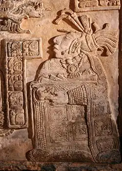 There is a glyphic record that sometime before 731 a lord of Motul was captured by a lord (Ruler B) of Machaquilá.[49] In 740, Machaquila attacked Motul de San José.[42] Hieroglyphic Stairway 3 at Dos Pilas records that in 745 a lord of Motul was captured by K'awiil Chan K'inich of Dos Pilas.[50] In the middle of the 8th century AD, Motul de San José was closely allied with the important city of Yaxchilan on the Usumacinta River, as demonstrated by the fact that the king of Yaxchilan Yaxun B'alam IV ("Bird Jaguar IV") who ruled from 752 to 768, took two wives from Motul de San José. They are named in inscriptions at Yaxchilan as Lady Wak Tuun and Lady Wak Jalam Chan Ajaw.[51] Lady Wak Jalam Chan Ajaw is shown preparing her husband for a battle that took place in 755 on Yaxchilan Lintel 41, now in the British Museum in London.[52] In fact, the alliance with Yaxchilan may date further back to the early 8th century since Yaxchilan Lintel 25 (dedicated in AD 723) used the so-called X-ray style of imagery that is closely associated with the Motul de San José polity.[53] However, relations with Yaxchilan were not always peaceful and Hieroglyphic Stairway 5 at Yaxchilan records that Itzamnaaj B'alam III of Yaxchilan defeated the lord of Motul some time in the latter part of the 8th century.[54]