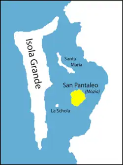Between the promontory of Lilybaeum (Capo Boéo) and that of Aegithallus (San Teodoro), the coast forms a deep bight, in front of which lies a long group of low rocky islets, called the Stagnone. Within these, and considerably nearer to the mainland, lies Motya island formerly called San Pantaleo, on which lie the remains of the ancient city. The island is nearly 850 m (2,790 ft) long and 750 m (2,460 ft) wide, and about 1 km (0.62 mi) (six stadia) from the mainland of Sicily. It was joined to the mainland in ancient times by a causeway, over which chariots with large wheels could reach the town.[9]