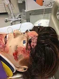 These illness and injury effects are applied to training manikins or simulated or standardized patients for training or other purposes. Simulation staff attend training to learn these techniques. It is argued that the use of moulage in simulation improves realism or participant buy-in.[8] Moulage is an emerging field of research for paramedicine, radiography and medical education,[11][12][13] with researchers exploring how moulage contributes to learning in training. Military training utilises highly-authentic moulage techniques to desensitise to graphic wounds, prepare for battle, and treat injuries.[14] New advancements in the field include using tattooed injuries and moulage through augmented reality.[15] The level of authenticity required for moulage remains unclear.[7]