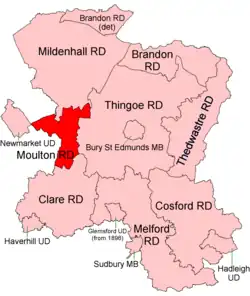 Moulton was a rural district in Suffolk, England from 1894 to 1935. It covered the area to the east of the town of Newmarket.
