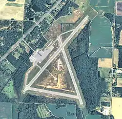 The airport covers 369 acres (149 ha) at an elevation of 294 feet (90 m). It has two asphalt runways: 4/22 is 5,129 by 100 feet (1,563 x 30 m) and 16/34 is 3,878 by 75 feet (1,182 x 23 m).[1] (Runway 10 closed in the 1970s.)