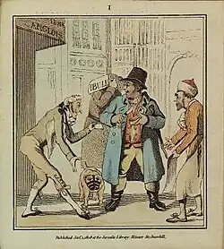 Mounseer Nongtongpaw was originally published by William Godwin's publishing firm, M. J. Godwin, in 1807 as part of its Juvenile Library series.[1] English editions have been located for 1811, 1812, 1823, and 1830 and Philadelphia editions have been located for 1814 and c. 1824.[2] The original edition was illustrated by a protégé of Godwin, William Mulready.[3] Shelley biographer Emily Sunstein speculates that some of the verses may have been written to match illustrations that were already designed.[4] The copper plate engravings are reproduced in Peter and Iona Opie's Nursery Companion.