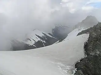 ![]() Mount Adams from the south-east, Escape Glacier at left, Siege Glacier (partially covered in rock debris) at centre. Late summer conditions. | |