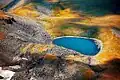Situated 40 kilometres (25 mi) northwest of the Armenian capital Yerevan, Aragats is a large volcano with numerous fissure vents and adventive cones. Numerous large lava flows descend from the volcano and are constrained in age between the middle Pleistocene and 3,000 BCE. The summit crater is cut by a 13 kilometres (8.1 mi) long line of cones which generated possibly Holocene-age lahars and lava flow.[1] The volcanic system covers an area of 5,000 km2 and is one of the largest in the region. More recent activity in flank centers occurred in Tirinkatar (0.48-0.61 Ma), Kakavasar, (0.52-0.54 Ma), and Ashtarak (0.58 Ma), as well as Jrbazhan in the summit area (0.52 Ma). The magmas feeding Aragats are unusually hot for arc-derived magmas, resulting in long and voluminous lava flows.[32]