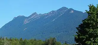 Mount Higgins is a 5,176-foot-elevation mountain summit located at the western edge of the North Cascades Range, in Skagit County, Washington.[3] Mount Higgins has two subsidiary summits, Skadulgwas Peak (4,986 ft) which is the fin-shaped middle peak, and also Mount Higgins Lookout Site (4,849 ft), the western sub-summit. The mountain is set on land administered by the Mount Baker–Snoqualmie National Forest. Mount Higgins is situated along the north side of State Route 530, mid-way between the communities of Darrington and Oso, near the site of the 2014 Oso mudslide. The nearest higher neighbor is Round Mountain, 0.93 miles (1.50 km) to the north-northeast.[1] This mountain is named for Oso homesteader Walter Higgins.[4] The first ascent was made in 1888 by John Higgins, Frank Lawrence, and Al Baker.[5] Precipitation runoff from Mount Higgins drains into tributaries of the Stillaguamish River. Topographic relief is significant as the south aspect rises 4,800 feet (1,500 m) above the Stillaguamish in two miles.