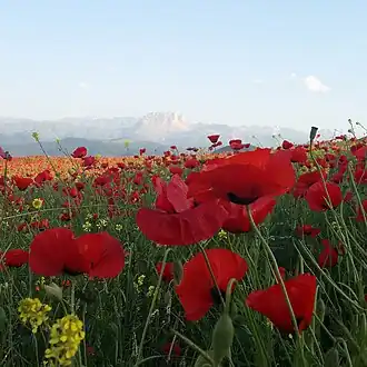 The Mount Kapaz or Kepez (Azerbaijani: Kəpəz dağı) is a mountain in Lesser Caucasus near Ganja city in central Azerbaijan. Kapaz rises 3,065 meters above the sea level. It is located next to Lake Göygöl and its huge rocks broke off the mount and blocked a nearby river during the 1139 Ganja earthquake; creating the lake.[2] In the Middle Ages, the mount was also called "Alparak", a name borrowed from Alparak lake (now Göygöl) translated from ancient Turkic languages as "the place covered by dam" (Al – below, lower part, space in front of something; parak – dam) referring to the big rocks which blocked the Agsu river and creating a lake.[3]