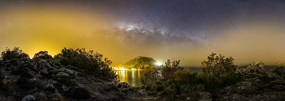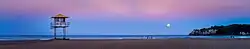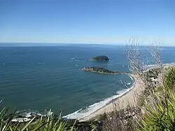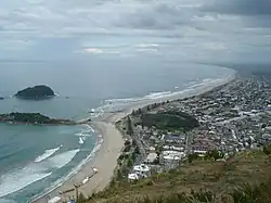 The ocean beach has Mauao or Mount Maunganui at its western end, and a man made land bridge connecting Moturiki Island at its eastern end.[6][7]