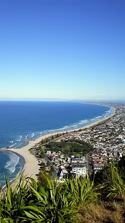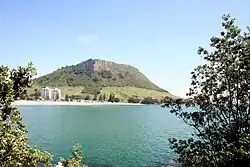 Mauao (The Mount) is a large lava dome[3] which rises above the town. According to Maori legend, this hill was a pononga [slave] to a mountain called Otanewainuku.[8] The conical headland which gives the town its name is 232 metres (761 ft) in height, and dominates the mostly flat surrounding countryside. It was formerly a Māori pā, and the remains of trenches can be seen in the ridges, as well as ancient shell middens. Today, it is open to the public year-round, and is a popular place to either walk around, or hike up. From the summit, a good stretch of coastline can be seen in either direction, as well as the Kaimai Range to the west.