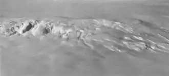 Mount Moulton is formed by a 40-kilometre-long (25 mi) complex of glaciated but largely uneroded[8] shield volcanoes[14] with two or possibly three[17] ice-filled calderas,[8] each of which is about 5–7 kilometres (3.1–4.3 mi) wide.[12] The calderas are 8 kilometres (5.0 mi) apart[14] and located at the Prahl Crags, Britt Peak and potentially Kohler Dome localities.[12] Additionally the Prahl Crags – remnants of the former caldera rim – are found south, Gawne Nunatak west, Edwards Spur northeast and the Moulton Icefalls on the northern side of the mountain.[8] The total volume of the complex is about 325 cubic kilometres (78 cu mi),[14] comparable to that of Mount Shasta in the Cascade Range, and is one of the largest volcanoes in the Flood Range and Ames Range.[9] Only the western part of the Mount Moulton emerges from the ice.[18]
