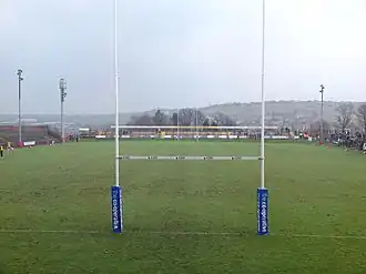 The Mount Pleasant pitch is sloped and is on a hill overlooking Batley. The end of the ground at the top of the hill has three grandstands. Behind the rugby posts is a terraced stand, which houses the players changing rooms and executive boxes.