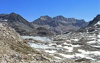 Mount Powell is a 13,364-foot-elevation (4,073-meter) mountain summit located on the crest of the Sierra Nevada mountain range in California, United States.[3] It is situated on the shared boundary of Kings Canyon National Park with John Muir Wilderness, and along the common border of Fresno County with Inyo County. It is also 19 miles (31 km) west of the community of Big Pine, and 1.17 miles (1.88 km) west of Mount Thompson, which is the nearest higher neighbor.[1] Mount Powell ranks as the 81st highest peak in California,[4] and the 10th highest of the Evolution Region of the Sierra Nevada.[1] The west summit is unofficially known as "Point John."[5] Two other peaks on the mountain are informally called "Point Wesley" (13,356 ft) in the middle,[6] and "Point Powell" (13,360+ ft) one-half mile to the east.[7]