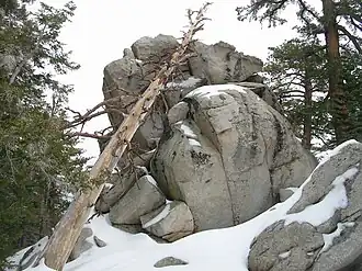 The Mount San Jacinto State Park encompasses the weathered granite summit of Mount San Jacinto, which at 10,834 feet (3,302 m) above sea level[3] makes this the second highest peak and mountain range in Southern California. It is accessible by the Palm Springs Aerial Tramway and lies on the Pacific Crest Trail.