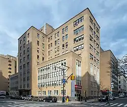 The central administration building—also called the Muhlenberg Pavilion, for the hospital's founder—is set back from 113th Street.[60] It was one of the five original pavilions opened in 1896.[35] The building was topped by a dome, which rose 140 feet (43 m) and was compared to that of the Luxembourg Palace,[56][57][59] though St. Luke's dome was demolished in 1966.[37] West–east corridors ran across each floor, and elevators connected the floors, allowing sick patients to be transported more easily. As planned, the first (ground) floor was to be a lobby and offices; the second to fourth floors, a children's ward; the fifth floor, dining rooms; and the sixth floor, operating theaters.[61] An open court was placed in front of the central pavilion.[28]