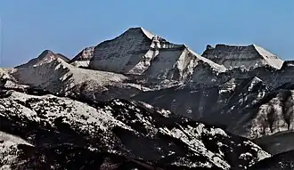 ![]() Mount Stimson's west aspect, centered (Mount Pinchot to right) | |