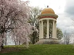 "Mr. Strauch designed the Temple of Love in 1845, which still stands as an outstanding landmark to Mt. Storm today. The white columns of this Corinthian style pergola, which can be seen on the east lawn, was once the cover for a reservoir that supplied water to Mr. Bowler's seventeen greenhouses, gardens, orchards, and a waterfall and swan lake on which seven black swans swam." [2]