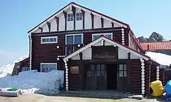 The mountain climbing trail between Mount Tsubakuro and Mount Yari is called Main Street (表銀座, Omote-Ginza) owing to its extensive use over time. It has two mountain huts along the way. Tsubakuro mountain cottage (燕山荘, Enzansō) is near the summit and is one of the oldest mountain huts in Japan, completed in 1921.[4]