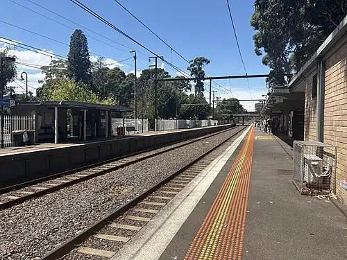 Mount Waverley railway station is a commuter railway station in the suburb of Mount Waverley in the south east of Melbourne, Victoria, Australia, and is part of the Glen Waverley line on Melbourne's suburban rail network.[4] The station opened in 1930, as a part of the extension from East Malvern to Glen Waverley.[5] The station consists of two side platforms which are connected to each other via adjacent roads and a pedestrian subway.[4] Additionally, the station is served by bus routes 623 and 733.[6][7] The station is approximately 18 kilometres (11 mi) or around a 30-minute train ride away from Flinders Street.[8]