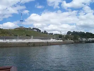 With the Devonport Lines protecting the Dockyard from landward attack, Mount Wise provided the key vantage point for defending against an attack from the sea. An octagonal redoubt with stone walls was built on Mount Wise in the 1770s, forming an emplacement designed to house guns for the purpose of defending the Royal Dockyard. In 1806 a semaphore signalling station was built within it, the last of a series of 32 linking Plymouth with the Admiralty in London. In the 1960s much of the structure was demolished, but many relics survive such as the external walls, semi-circular metal racer rails for the guns, World War II barage balloon anchoring rings, ammunition recesses and iron rings for manoeuvring the heavy guns.[21] In 1998 a 40-metre-high (130 ft) mast was built, with circular viewing platform for recreational use by visitors, giving panoramic views, most notably westward to the Royal William Yard.