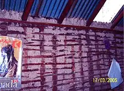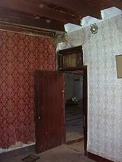 The external walls were rendered with lime plaster, concealing the framework and mud infill and giving the dwelling a less primitive appearance than many homes constructed using similar techniques and materials. The downstairs internal walls were wall papered. The upstairs internal walls were timber lined and painted with some sections having been replaced with fibro cladding. Some ceilings are lined with fibro and others with calico. A timber ladder provides access between ground and first floors.[1]