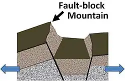 When a fault block is raised or tilted, a block mountain can result.[17] Higher blocks are called horsts, and troughs are called grabens. A spreading apart of the surface causes tensional forces. When the tensional forces are strong enough to cause a plate to split apart, it does so such that a center block drops down relative to its flanking blocks.
