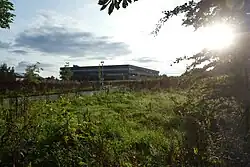 The first building in Upper Mountjoy was the Psychology Building, built in 1966–70 on the site originally intended for Grey College. It was designed by Whitfield and partners and Pevsner noted that it was "probably worth a climb through the wood into the farmland in which it is set", and that there were clear links in its design to the lecture theatre in the West Building and similarities to the later business school, also by Whitfield Partners.[63][74] The botanic garden moved to a new site on Hollingside Lane on the south side of Buck's Hill in 1970, occupying part of the grounds of Oswald House behind Collingwood College.[67][75]