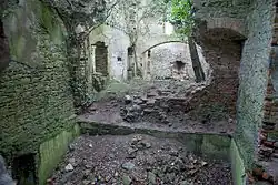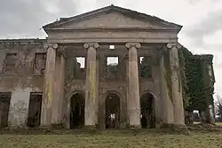 The house was built in neo-Palladian style. The front 7-bay entrance was adorned by four ionic columns, the rear had a large conservatory. Following its destruction in 1920, it has stood as a ruin, and has been partly demolished. However, the front columns still stand, as well as most of the main wings of the house.