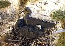 The mourning dove (Zenaida macroura) is a member of the dove family, Columbidae. The bird is also known as the American mourning dove, the rain dove, the chueybird, colloquially as the turtle dove, and it was once known as the Carolina pigeon and Carolina turtledove.[2] It is one of the most abundant and widespread North American birds and a popular gamebird, with more than 20 million birds (up to 70 million in some years) shot annually in the U.S., both for sport and meat. Its ability to sustain its population under such pressure is due to its prolific breeding; in warm areas, one pair may raise up to six broods of two young each in a single year. The wings make an unusual whistling sound upon take-off and landing, a form of sonation. The bird is a strong flier, capable of speeds up to 88 km/h (55 mph).[3]