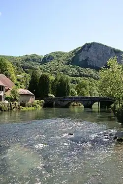 The village is located in the upper Loue valley, just downstream of its source, in a particularly scenic landscape consisting of a natural amphitheatre dominated by steep cliffs. Other prominent features of the scenery are the 50-metre (160 ft) Syratu Falls, the Gorges de Nouailles, a canyon up to 350 meters deep, the Baume Archée and Faux-Monnayeurs caves and the source of Pontet.
