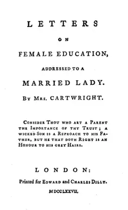 Cartwright's first publication, Letters on Female Education, addressed to a Married Lady (1777), offers advice to a mother on how to bring up her daughters. It was translated into German in 1778 alongside works by Hannah More and Hester Chapone.[1] One critic wrote, "These letters have as much originality in them as we generally find in compositions of this nature. At least they discover the indications of a rational understanding and good heart."[2] In the preface, Cartwright claims that she had been encouraged in this project by Elizabeth Montagu, an advocate for women's education and a leading figure in the London literary world. The author ends her remarks with the address "Warwick Court": presumably Warwick Court in Bloomsbury, London. This address is one of the few personal details known about Cartwright.