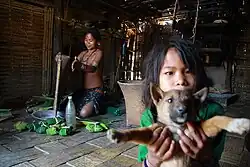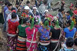 A man usually discusses with his father about the woman he intends to marry. The father along with his son and a few other villagers visits the house of the prospective bride. They bring three birds, a spear and a dah (dagger) with them and the spear and the dah are given to the bride's parents as presents and the fowls for the family to eat. In return, the bride's family cooks pork for the visitors. The visitors must not eat the fowls and the hosts the pork. The bride's father then consults with her daughter and after getting her consent, asks for a dowry. In 1931, it usually consisted of around Rs. 100 and the groom's father may not bargain. After the dowry is settled, the groom's party stays for three days, feasting on khaung and leaves the next day.[23] However, in case of a marriage, contracted between the couple without the parental consent, for instance, in a case in which a man elopes with a woman to his parents' house, the parents, with the village elders, return the bride to her parents along with three fowls and khaung. The groom's parents then ask what dowry the bride's parents would like to accept. The dowry, in this case, can be as high as Rs. 100 or as low as Rs. 30. Similar procedures as the one mentioned above take place, except that the groom's family does not stay over for a night but return home with the couple. Then the marriage date is chosen. The bride visits her home occasionally but never returns to live there permanently. If either party breaks the promise of marriage, no action is taken as long as either the bride or the groom claims that one does not love the other. If the bride breaks the promise, half of the dowry has to be returned whereas if the groom breaks the promise, his family loses the dowry. If the husband dies, the heir is entitled to nothing; she has to abandon the issue of marriage, if any, with her father-in-law or a brother-in-law.[24]