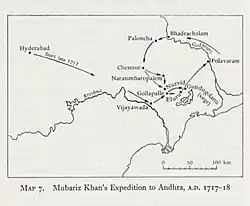 With the consolidation of power, Mubariz Khan began to punish the local zamindars for their delay in payments of tax. He moved from his capital to Vijayawada to punish them. By January 1717, in Gollapalle, he confined all Zamindars that came to his camp obediently and Khan only released them when the promise of payment was secured. He also began an expedition into the Eluru, Khammam and Kondapalli districts to obtain submission from the chiefs. Over a nine-month period Mubariz Khan led his army in a great circular route: north-east to Polavaram on the Godavari; up the Godavari to Bhadrachalam, the temple town; south-west away from the river to Paloncha ; to the east to Chennur, Narasimharapalam, and finally back to Rajahmundry, and by the end of the year to Eluru again. [10]