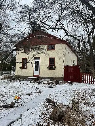 The Mud House is a historic home located at Penfield in Monroe County, New York. It is a 1+1⁄2-story, 24-by-38-foot (7.3 by 11.6 m) rectangular earthen building with gable roof. It was constructed about 1836 of clay, puddled with straw, and then rammed into forms above a fieldstone foundation and is a rare surviving example of rammed-earth construction and was part of the Brown Brothers Nursery owned by Don Brown. [2]