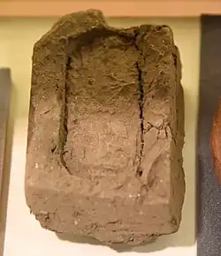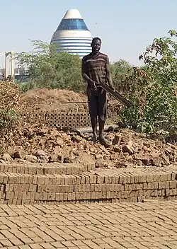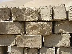 The history of mudbrick production and construction in the southern Levant may be dated as far back to the Pre-Pottery Neolithic A (e.g., PPNA Jericho).[2] These sun dried mudbricks, also known as adobe or just mudbrick, were made from a mixture of sand, clay, water and frequently tempered (e.g. chopped straw and chaff branches), and were the most common method/material for constructing earthen buildings throughout the ancient Near East for millennia.[2][3][4] Unfired mud-brick is still made throughout the world today, using both modern and traditional methods.[5][6]