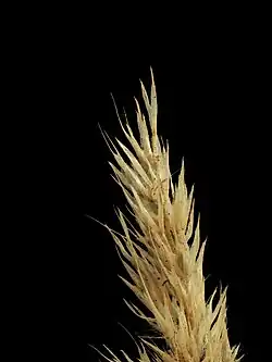 Muhlenbergia andina is a rhizomatous perennial grass growing 25 to 85 centimeters tall. The inflorescence is a narrow, dense cluster of appressed, upright branches bearing small, silky-haired spikelets.