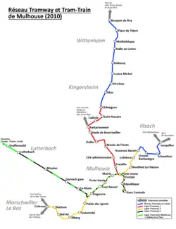 The Mulhouse tramway (French: Tramway de Mulhouse; Alsatian: D'Strossabàhn Milhüsa) is a tram network in the French city of Mulhouse in Alsace, France. It commenced service in 2006, and now comprises three purely tram lines, plus one hybrid tram-train line.[2]