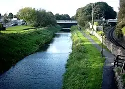 The town developed at a fording point on the River Brosna.[9] Evidence of ancient settlement within Mullingar include records of a motte-and-bailey castle, a tower house known as Mullingar Castle, a number of fortified houses and several water mills.[9] The town's Irish name, An Muileann gCearr meaning a "wry or left-handed mill", refers to one of these mills.[10]