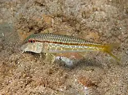Mullus barbatus (red mullet) is a species of goatfish found in the Mediterranean Sea, Sea of Marmara, the Black Sea and the eastern North Atlantic Ocean, where its range extends from Scandinavia to Senegal. They are fished, mostly by trawling, with the flesh being well regarded. The International Union for Conservation of Nature has assessed their conservation status as being of "least concern".
