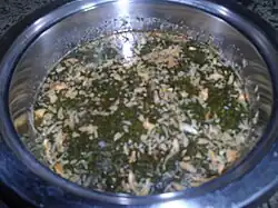Upon preparation the leaves are chopped finely, often with a mezzaluna. The leaves are then boiled in broth; if meat or seafood is being used, it is added at this point, and may be bone-in or boneless.[16][13] Coriander and garlic are fried separately in ghee or oil to make the ta'leyya (تقليه, literally "a frying" or "fried thing"), and then added to the soup at the end while the ta'leyya is still sizzling.
